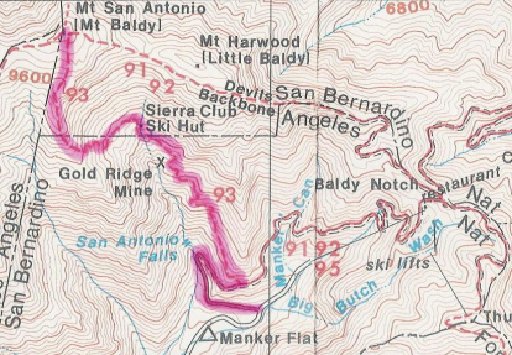 | Here's a map of my route. Go here for a larger map. The hike from Manker Flat to Mt. Baldy via the Sierra Club Ski Hut is about 5 miles each way, with an elevation gain of about 3200'. |