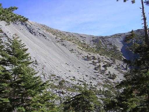 | The "scree" of Baldy Bowl. Russ says many people, including himself, actually climb UP the bowl in the winter. No, thank you! |