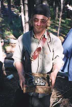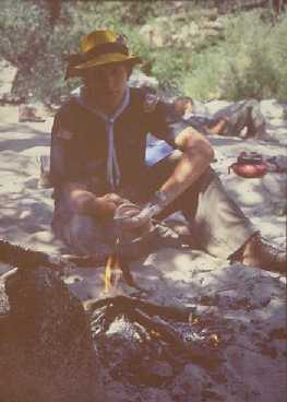 | That summer I ran 5 one-week survival courses. 83 boys and men participated in the program. 30 years later it remains a cherished memory! Go here for more information. The picture at the right was taken during one of those courses: I am cooking a rattlesnake where the Pacific Crest Trail meets Deep Creek. Sadly, scouting has been watered down so much I doubt a course like this would be allowed today. Regardless, it wouldn't happen at Ahwahnee because the camp was sold the following year. |