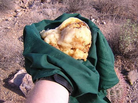 | I used my cup to scoop some pulp out of the cactus and into my bandana. It immediately began dripping: clearly a lot of moisture. |