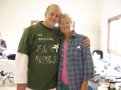 | My daughter Cora and her husband Peter live in Michigan. They surprised me by showing up...with homemade t-shirts! Shirts refer to a family joke of two years ago. |
