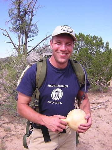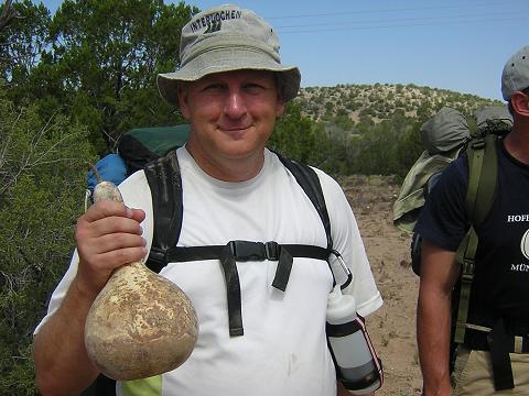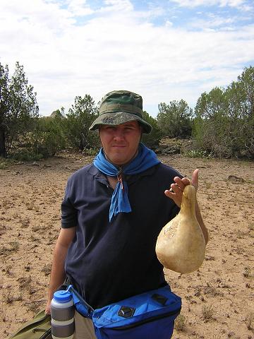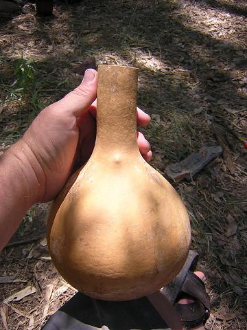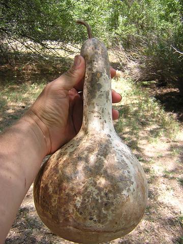 | Gourd canteen project. Start with gourd. Take it down to the creek and scrub it with wet sand to remove the white stuff, which is really just mold. |