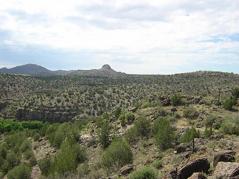 | This plateau is bone dry, but there's some promising greenery down there! |