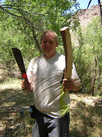 | Me with a bola knife and my partially completed rabbit stick. We used tamarisk, also known as salt cedar. It is a hardwood commonly found in, but not native to, this country. |