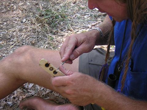 | Cody demonstrates the use of a bola knife in making a rabbit stick. |