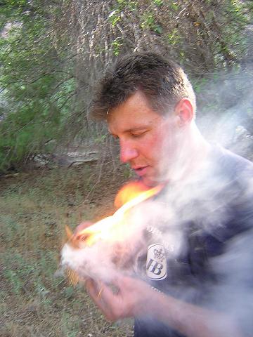 | Blowing an ember into a flame. I've made fire with a hand drill working as a team, but this was my first time start-to-finish alone. |