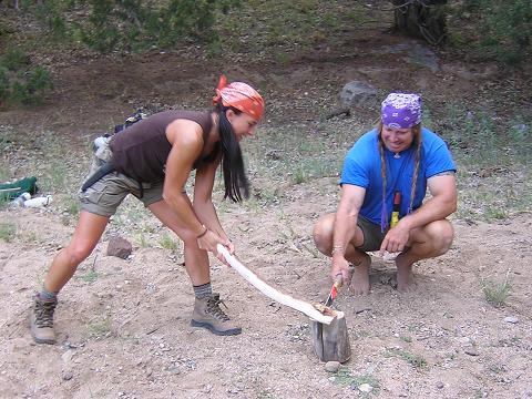 | Dawn attempts to split a piece of cottonwood from which she will make a bowl. "Nice biceps, Xena." |