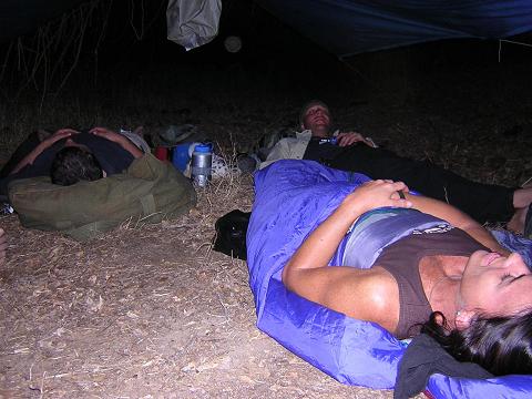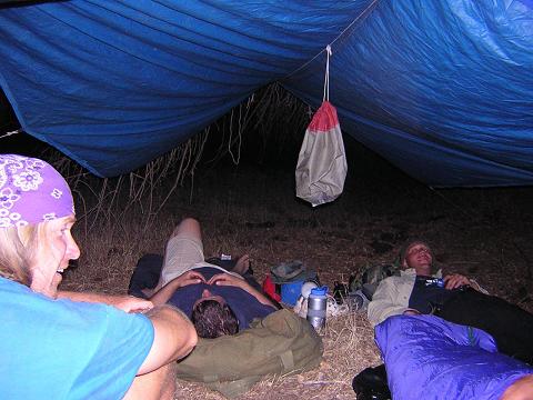 | When it started to rain, we retired to our sleeping bags under the tarp. The rain was, however, very shortlived. |