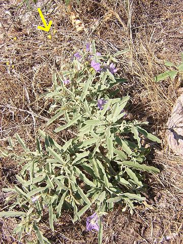 | Silver nightshade. Pretty purple flowers. A member of the tomato family. Notice the yellow fruits. This plant and its fruits are not edible. |