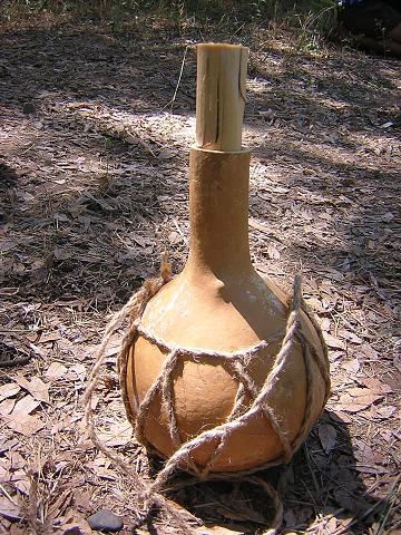 | After washing gourd, cut off the top. Use a long flexible stick to clean out the insides as best you can, then take it down to the creek and rinse the inside repeatedly with a slushy mixture of water, sand and pebbles. |