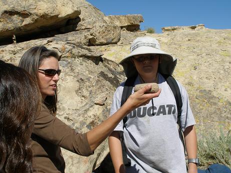 Cheryl shows Austin and the group a mano (grinding stone.) |