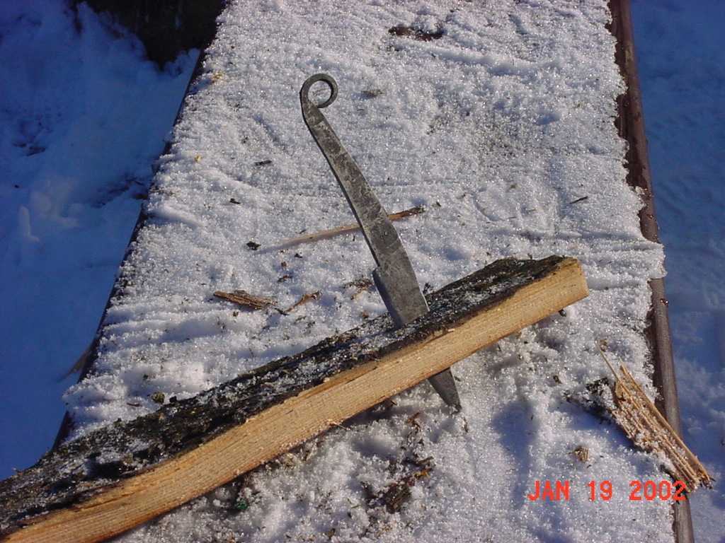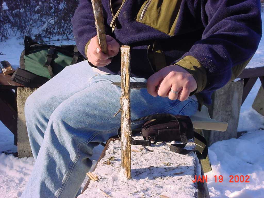 | While on a winter scout outing, I came across a fire circle with some lumber scraps buried in snow. I thought it would be a nice chance to see how my neck knife would work as a splitter. |
