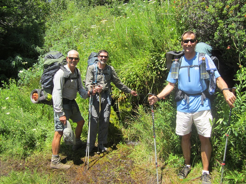Paul, Ray, and Brian at a trailside seepage. I tend to be quite cavalier about water purification: I often drank untreated water. This was delicious. (When I do purify, I use Iodine, in particular, Polar Pure.) [018] |