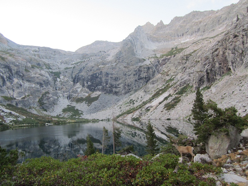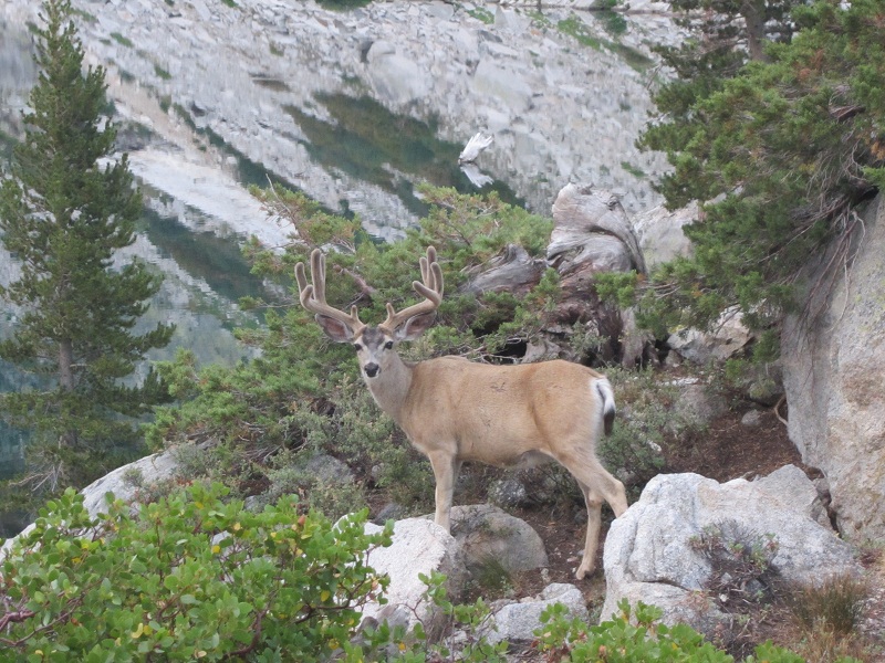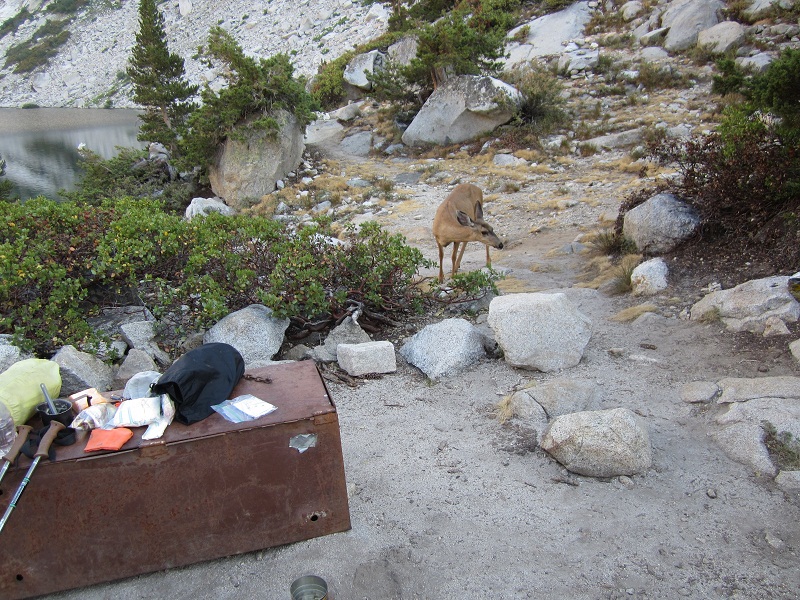 The deer at Hamilton Lake are quite brazen. I was warned about them last year when I was here, but I didn't see this behavior because I had camped right at the shore of the lake, on the granite. I was warned that they would come into camp and try to steal your clothing from wherever you had hung it because they wanted the salt from your sweat. Sure enough, shortly after I fell asleep (or what passes for sleep for me) I heard something and sat up just as a deer was going for my shirt, which I had draped over a bush to dry. I didn't make the connection and went back "to sleep" and shortly after the same thing happened again. This time I took my shirt and bandana and rolled them up and put them under my sleeping pad. From my journal: "Comfortable night but no sleep for me. Just awful." (Damn apnea.) [026] |