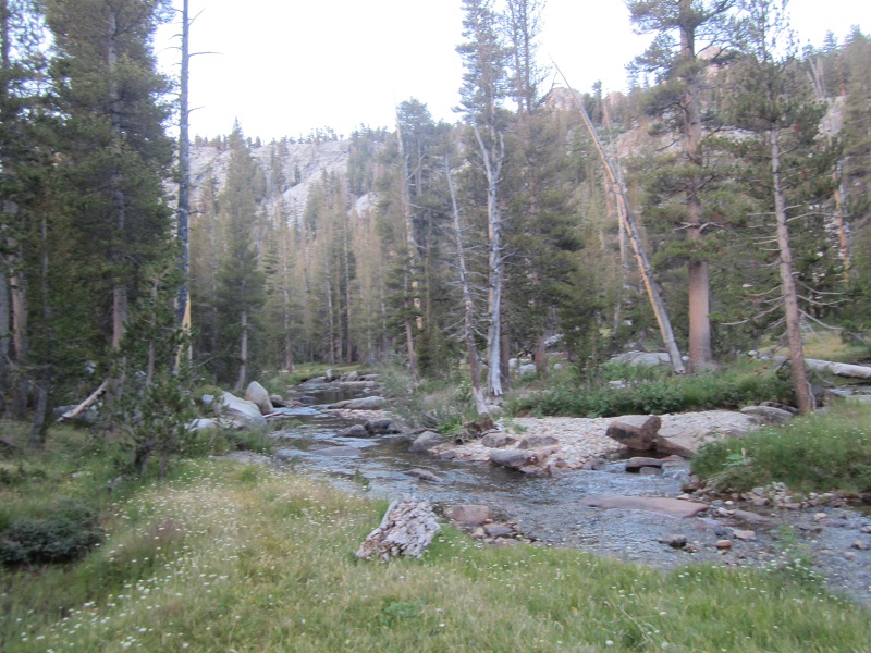About a mile into the hike you reach Eagle View. I have to go over the mountains you see in the background. I didn't take very many pictures for the rest of the day, as I had been on this same trail last year. I had planned to stop at Mehrten Creek, just like last year. I was exhausted by the time I got there. The lack of sleep the previous night and the high altitude were taking their toll. I layed down on my sleeping pad and slept for about an hour. I felt much better when I woke up and decided to continue on, if for no other reason than to give those who were following my progress via my SPOT transmitter the impression that I was doing better than I had planned. My family had urged me to cancel my hike. As I have already mentioned, less than two months earlier I couldn't even stand up. And while at my sister's house, I couldn't walk up two steps -- I would instead lead with my right leg and kinda drag my left leg up to meet it. The weekend before my hike I had planned to take a shakedown day hike in the San Gabriel Mountains, without a pack, but I canceled that because my leg was hurting too much. So despite the frequent reminders from my daughters that I was being a dumb ass, I started my hike. In hindsight, they were right and I was wrong. I would often regret my decision. But I'm glad I did it. [008] |