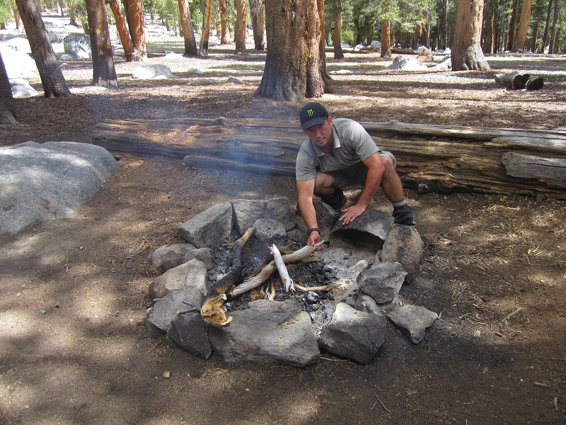 This is Steve Egusquiza, a former Navy rescue swimmer. He was a very strong backpacker. We met him at Big Arroyo, and he camped with us at Moraine Lake and Kern Hot Springs. Steve likes a nice campfire! [055] |