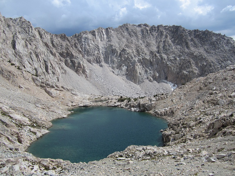 This lake is immediately below Forester Pass (not shown in this picture). From here it is a steep but relatively short walk to the pass. Note how quickly the clouds have changed. I need to decide if I should attempt to go over Forester, or just hunker down here. I decide to go for it. [091] |
