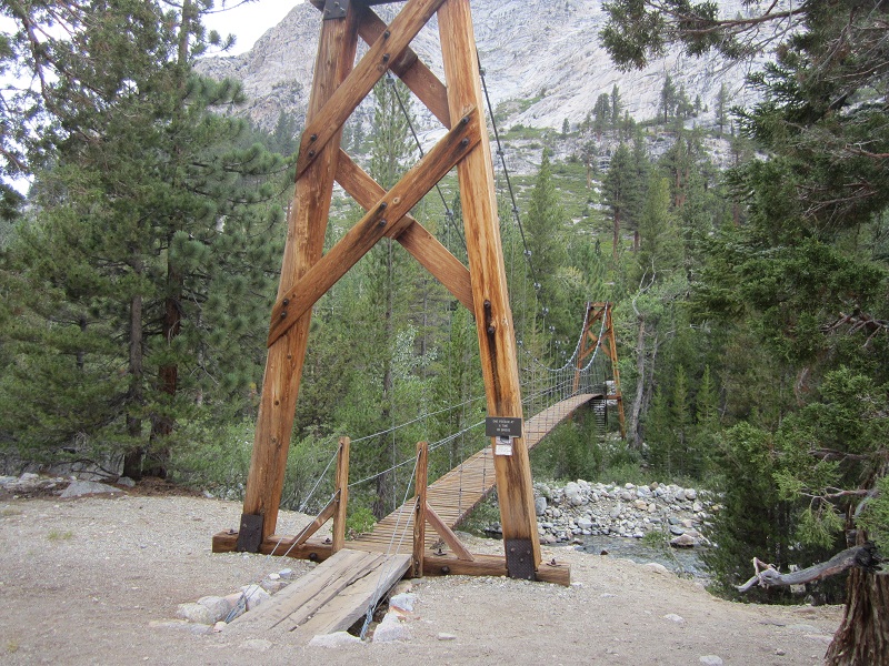 Me at Woods Creek Bridge. From my journal: "I am now at the Woods Creek suspension bridge. It is 2pm. My schedule says to stop here, but I want to see if I can get at least halfway up (yes, up!) Pinchot Pass, stopping at Shepherd Pass trail. Ideally, Pinchot Pass, but it is 3750' in 6 miles. It would be dark -- if not thundering -- by the time I got there. I have only done 7 miles today -- all downhill." I continued on... [115] |