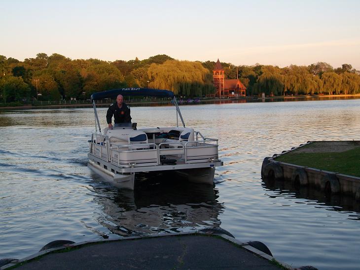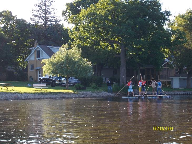 This was the Varsity team's test of a four sheet pop bottle raft. The team put the raft in north of St. Charles North High School. Eric Chock followed the raft in his pontoon boat in case a resue was necessary. There weren't any problems, but the raft was eventually towed to Boy Scout Island due to fading daylight. The raft held up well and I think much was learned tonight. No boys or pop bottles were lost during this test. |